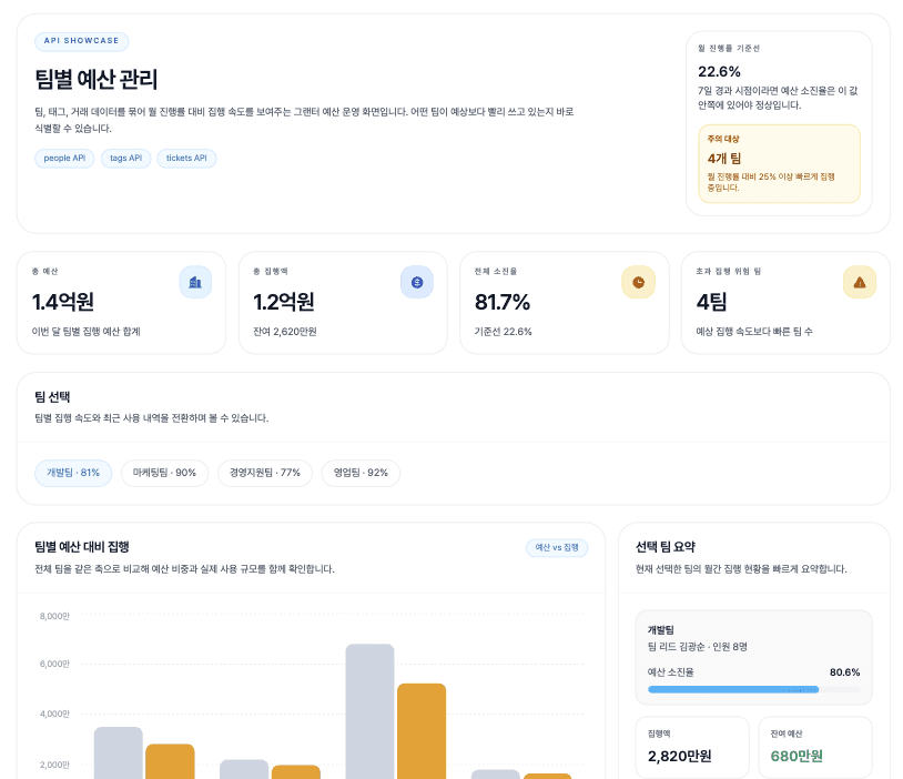 인원, 태그, 거래 데이터를 묶어서 부서별 예산 소진율과 카테고리별 사용 현황을 실시간으로 추적해요.
