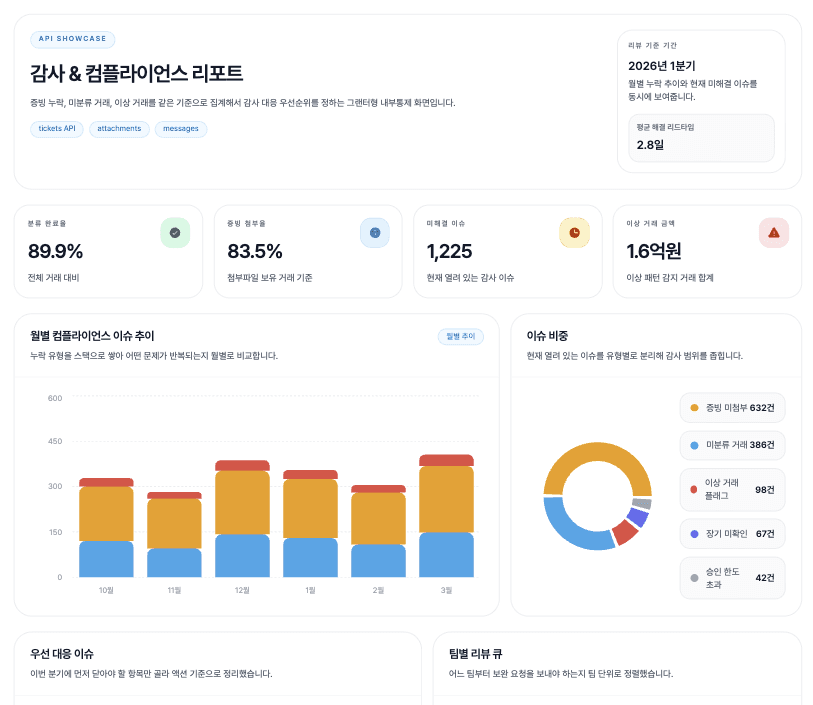 이상 거래, 증빙 누락, 장기 미확인 건을 확인해 감사에 대응하고 규제에 반영할 수 있어요.
