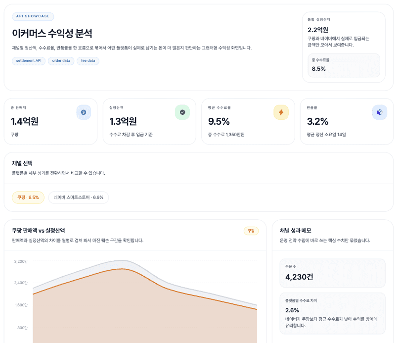 스마트스토어, 쿠팡 등 정산 내역과 비용을 매칭해 실제 브랜드별 마진과 수익성을 계산할 수 있어요.