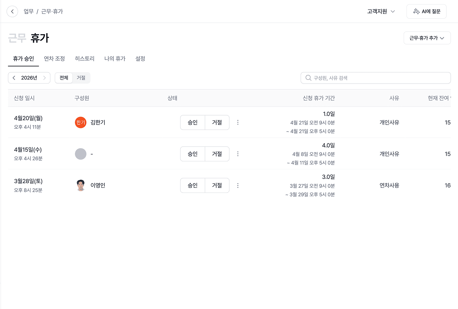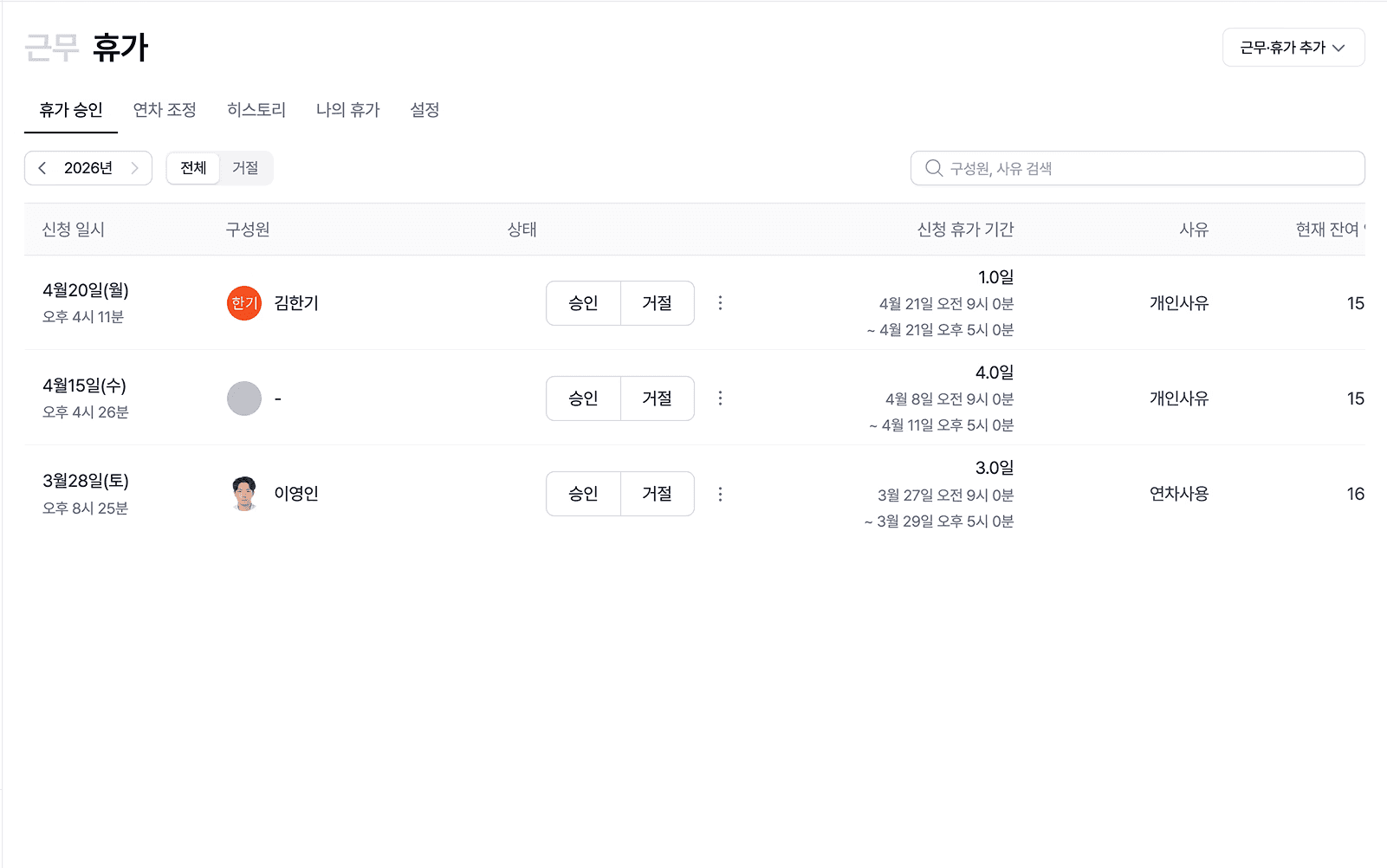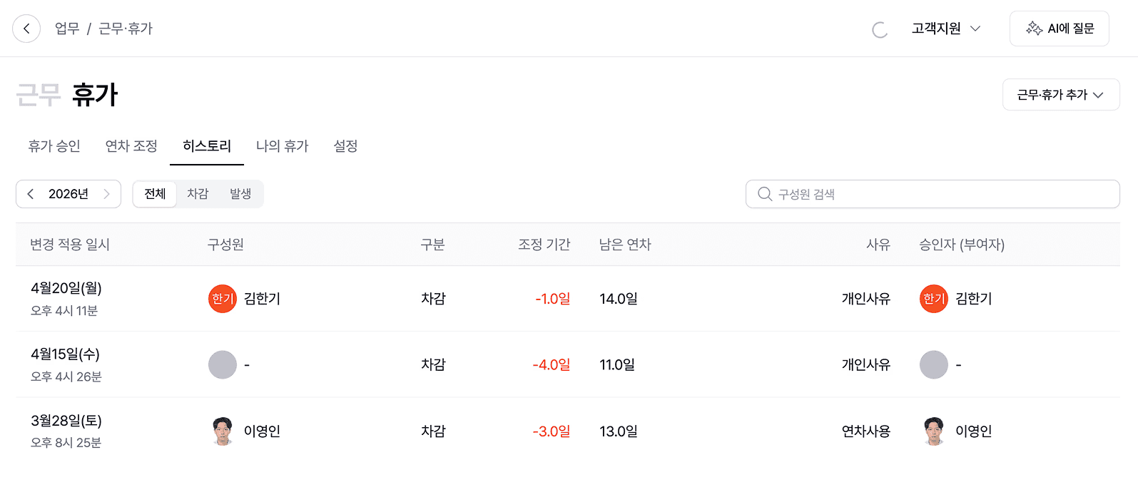 잔여 연차, 연차 관리 방식 설정은 물론,