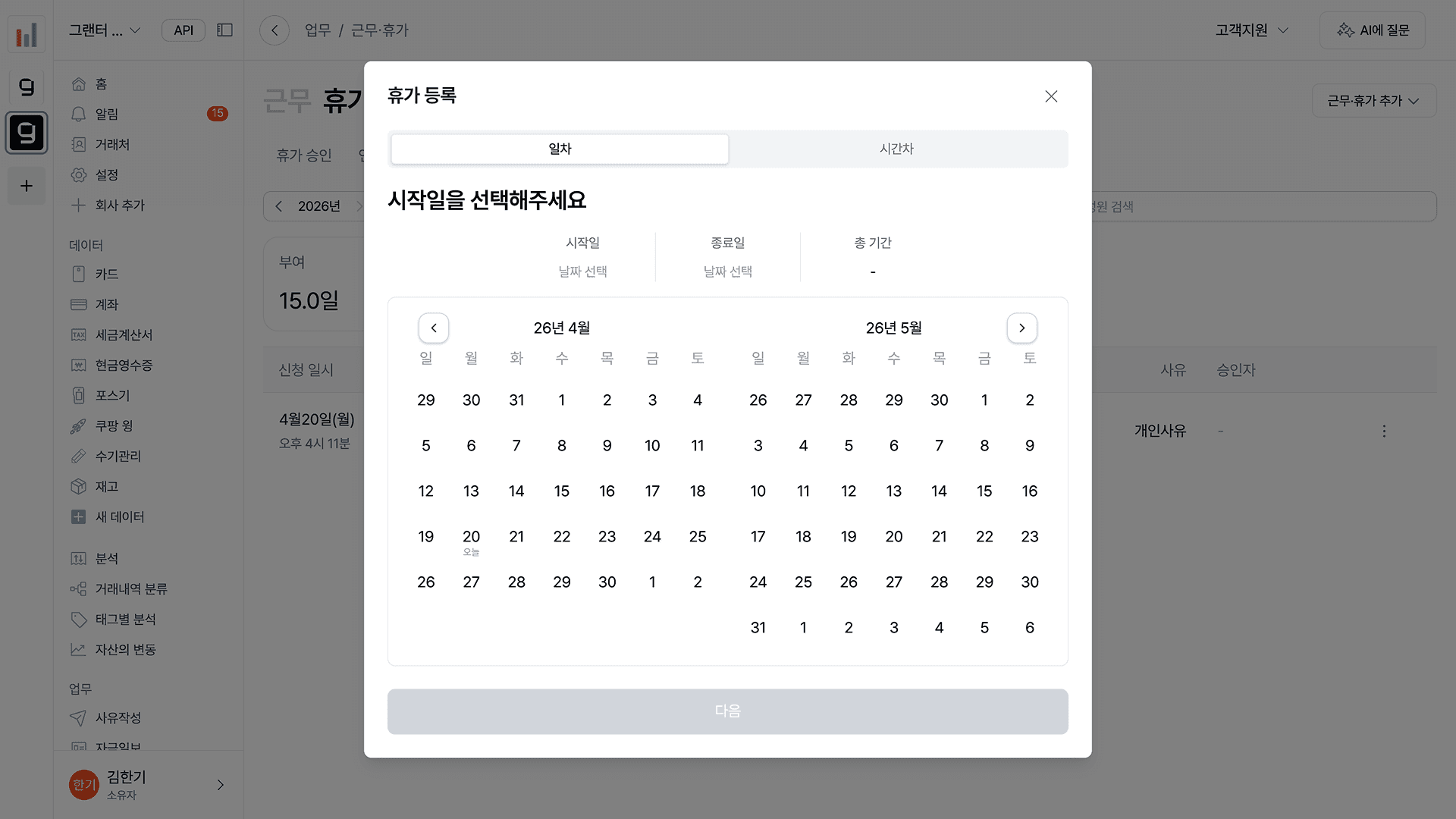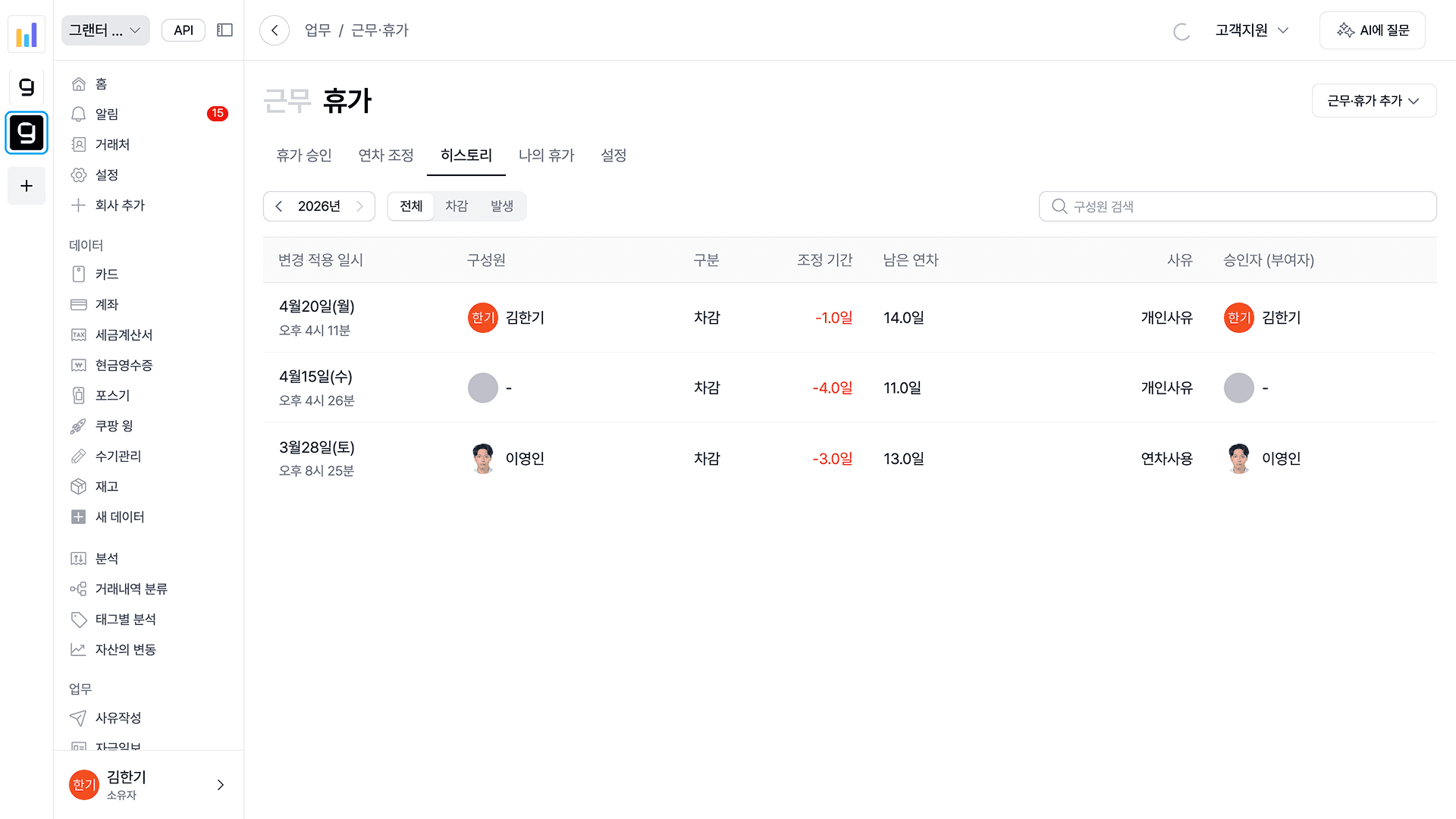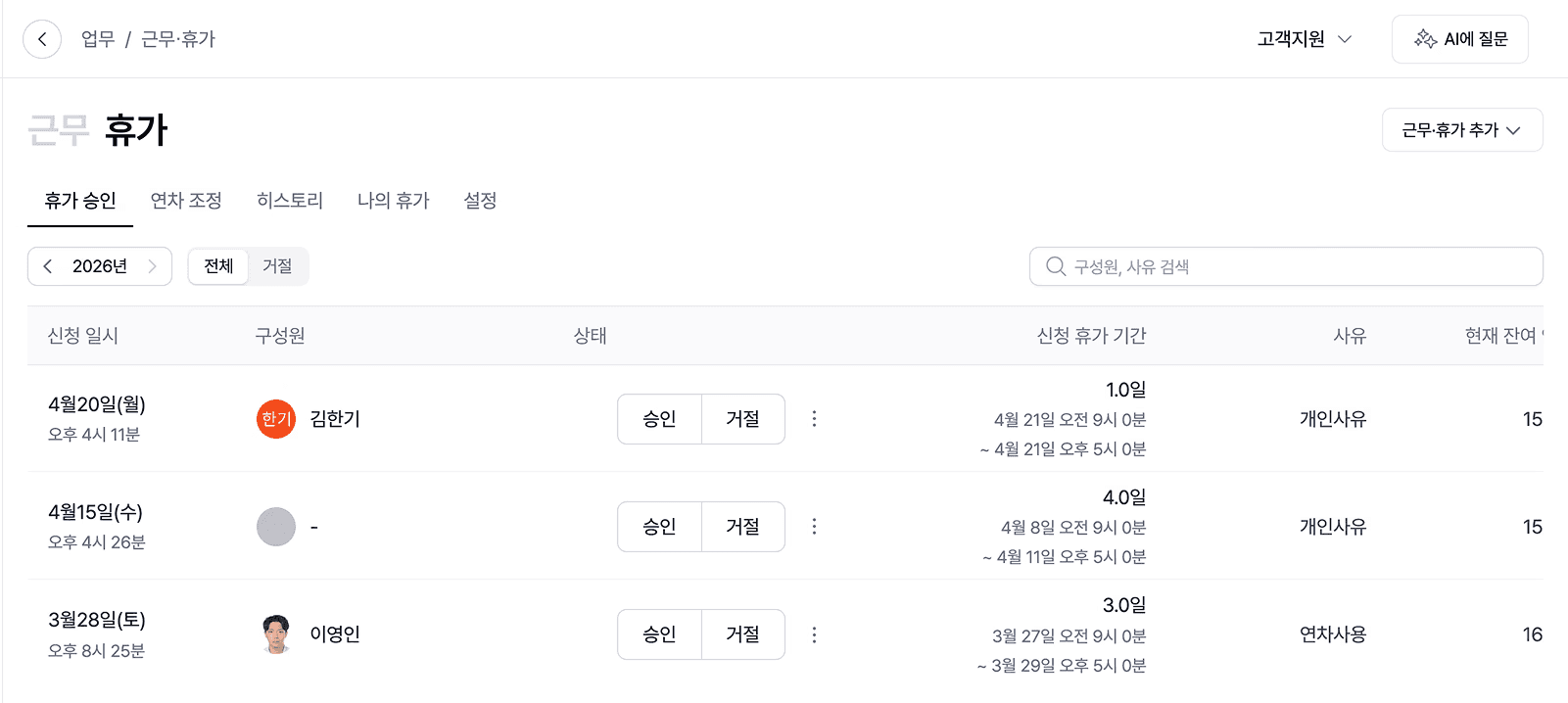 잔여 연차, 연차 관리 방식 설정은 물론,