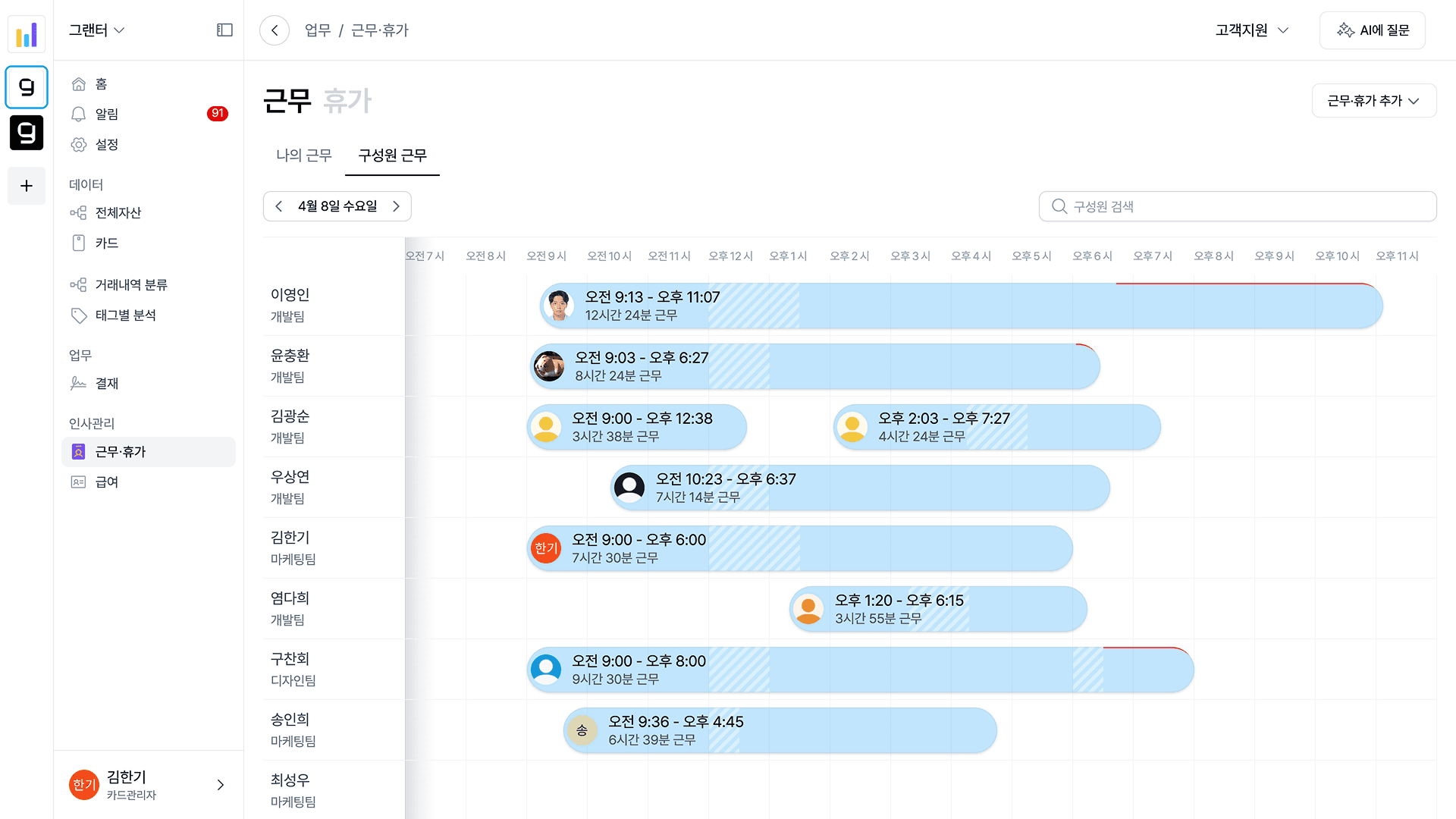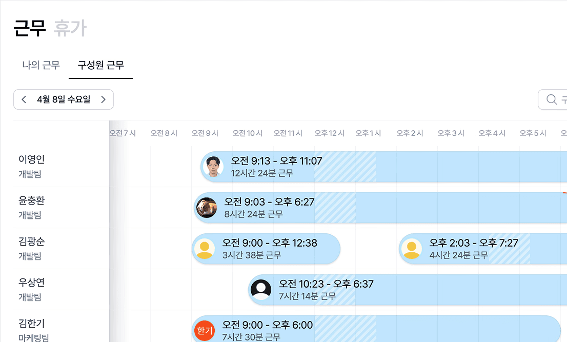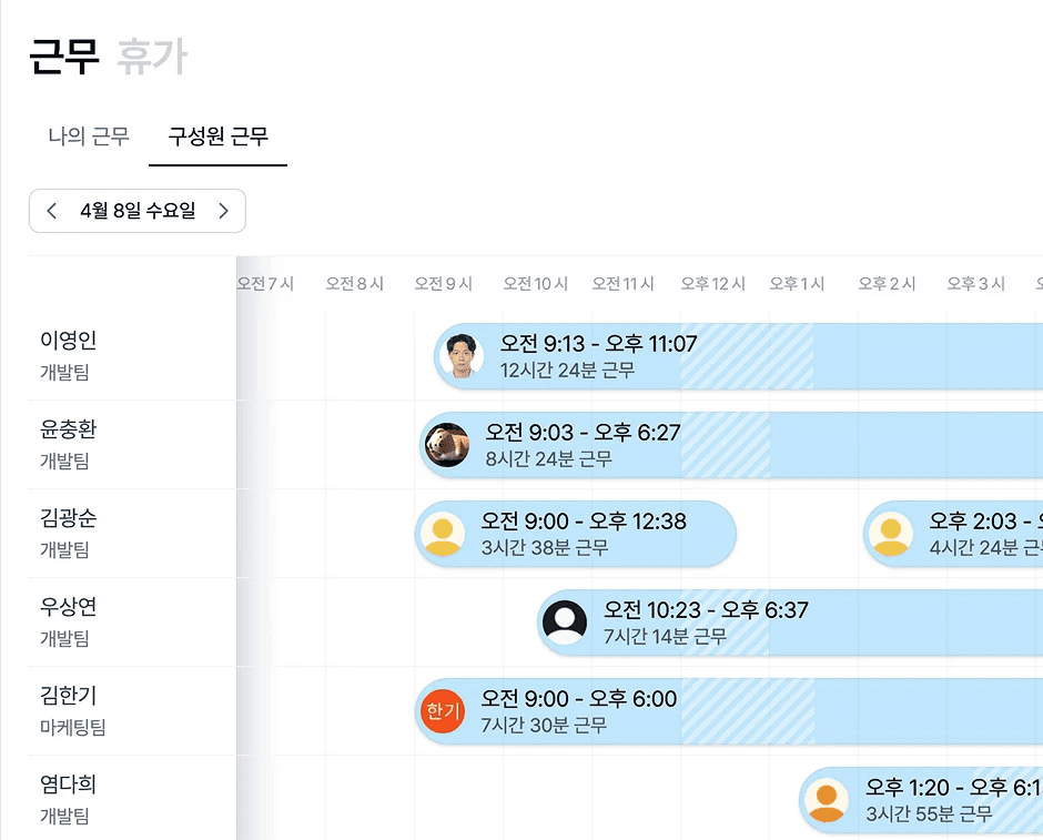 모든 구성원의 일자별 근무 현황을 볼 수 있어요.