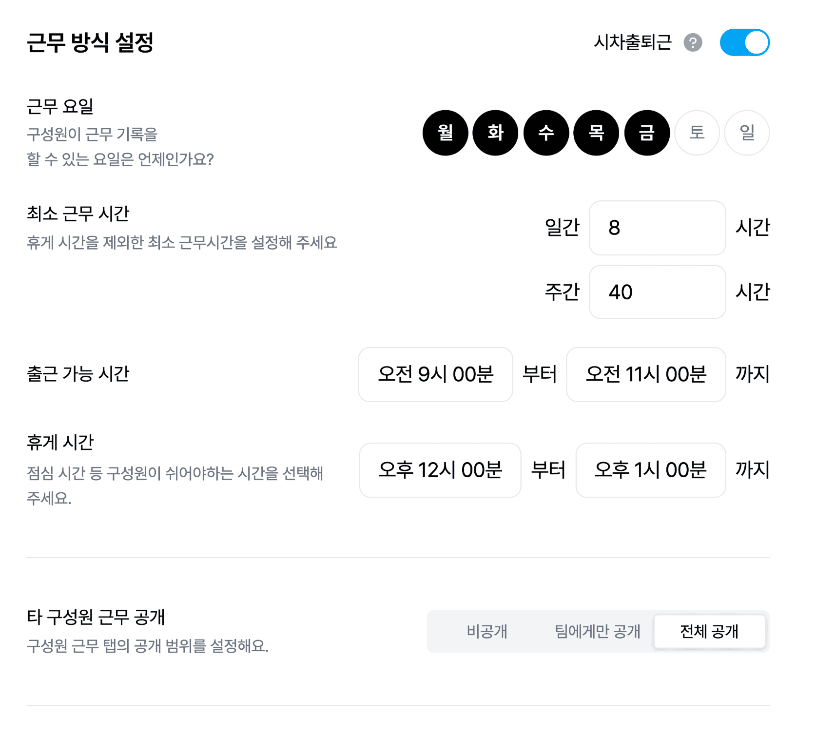 출근/휴게 등의 상세한 근무 설정이 가능해요.