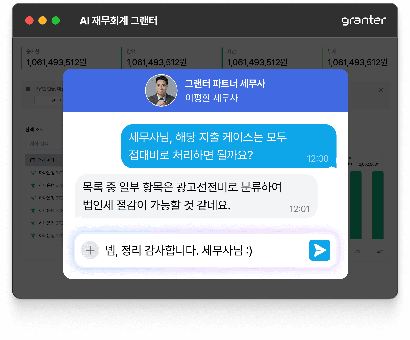 세무 처리와 관련있는 자산의 엑세스가 가능해요. 또한, 협의가 필요하거나 문제가 있는 항목도 그랜터 내에서 소통할 수 있어요.