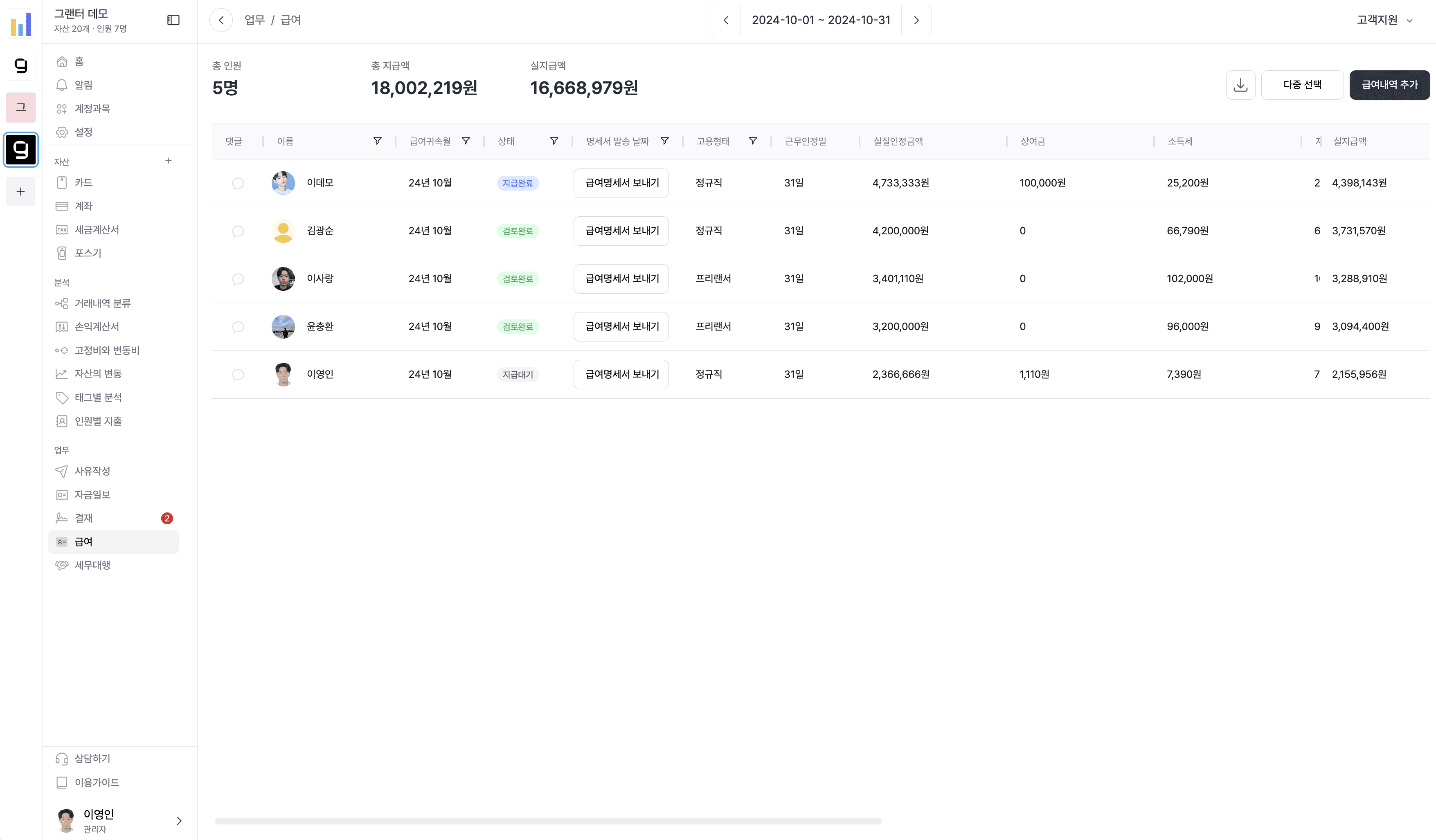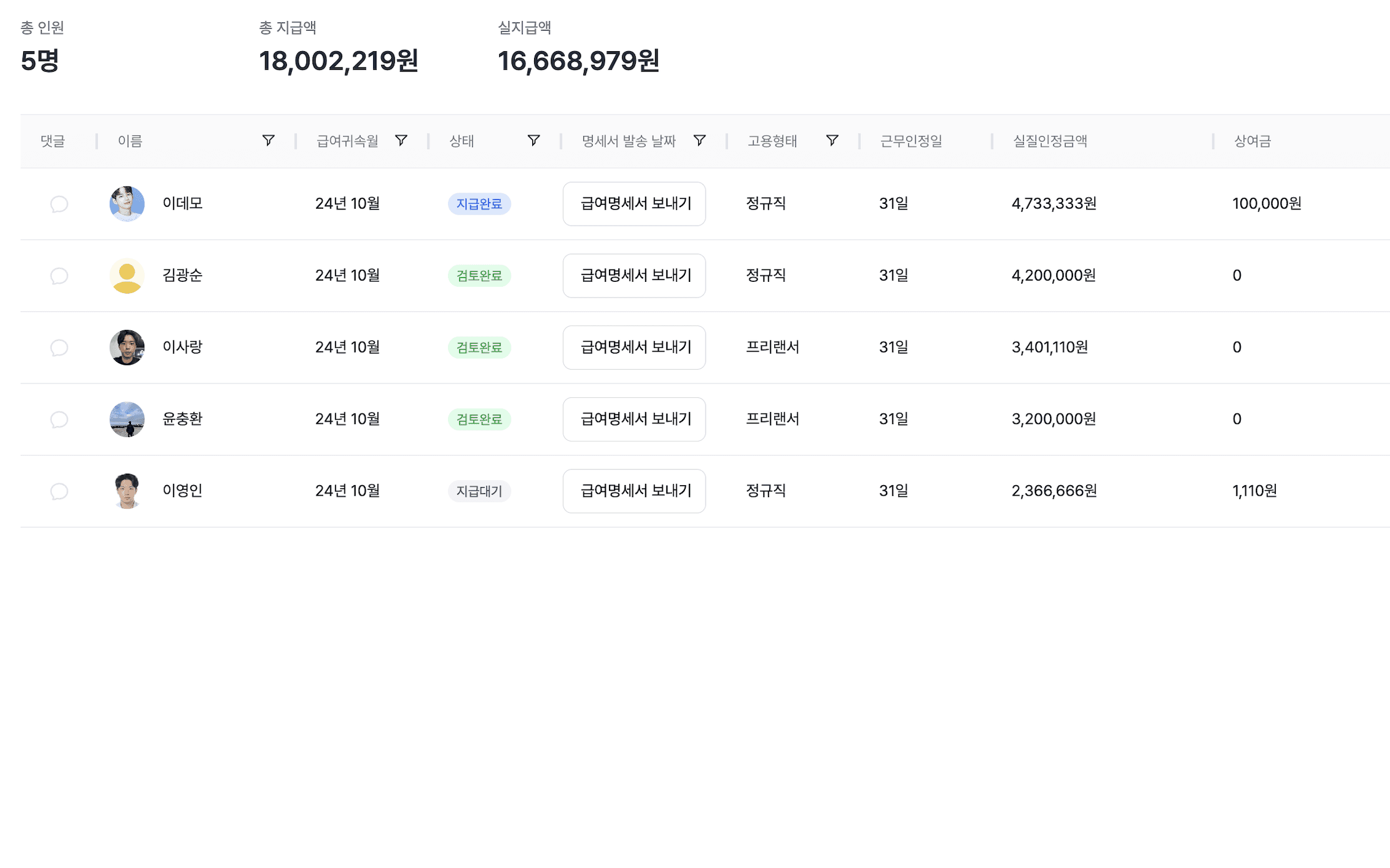 모든 구성원의 급여 내역을 확인하고 지급해 보세요.