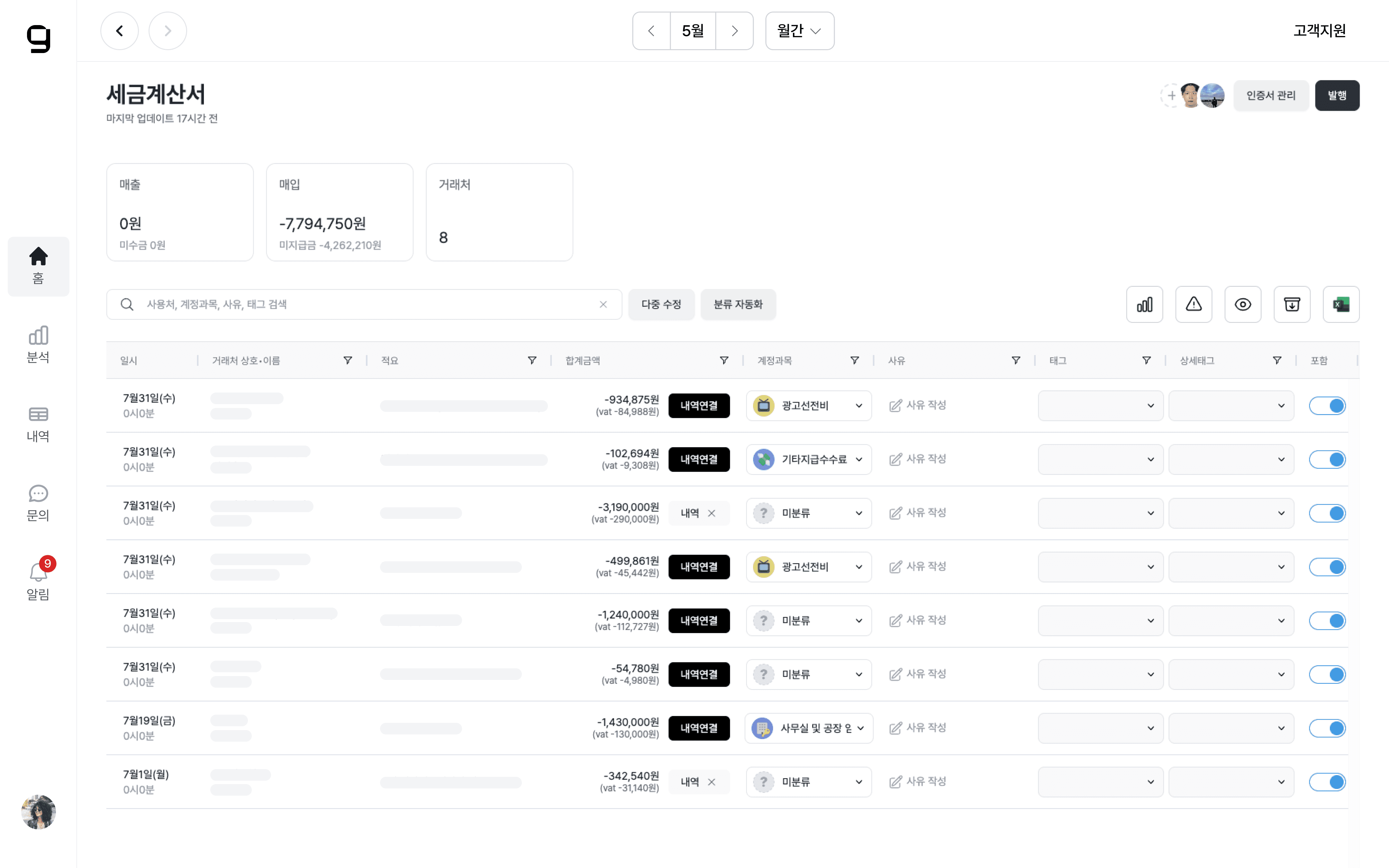 각 계산서의 내용과 카드/계좌의 실제 내역 연동하여 미수금 및 미지급금을 관리 할 수 있어요.